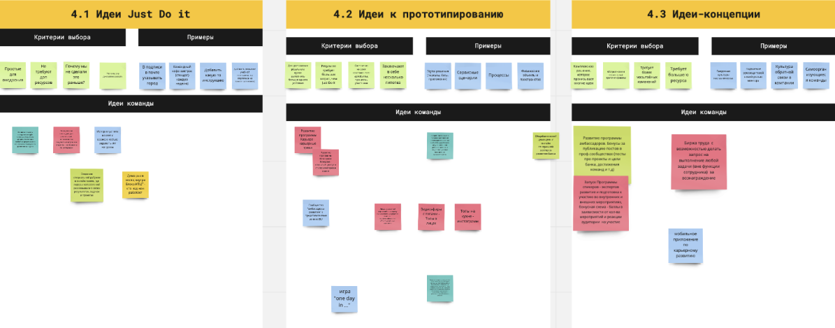 Чтобы отсортировать идеи, распределите их по трем категориям: идеи «Just do it», решения для прототипирования, идеи-концепции. Характеристики каждой категории есть на картинке во вложении.